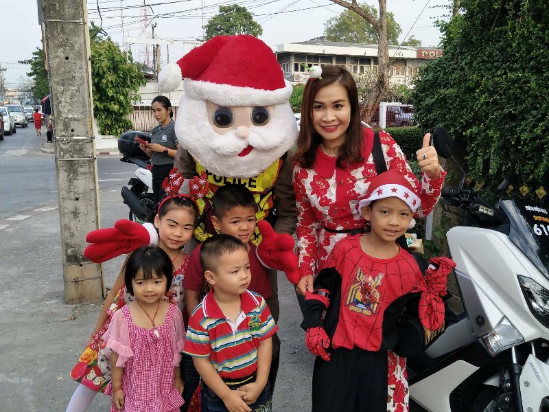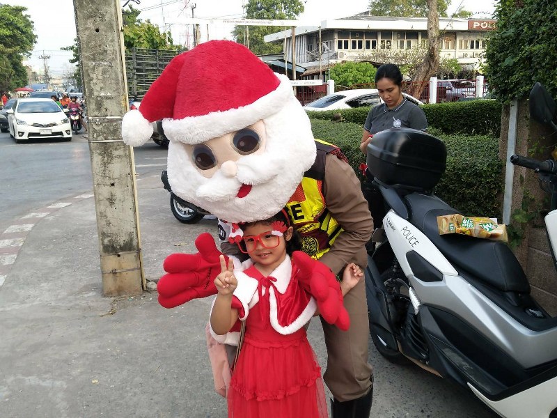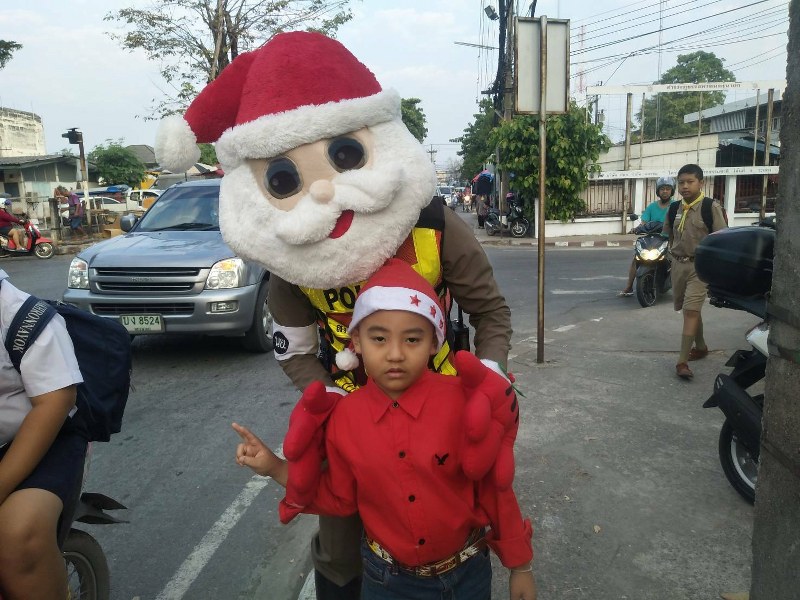 ตำรวจจราจรสถานีตำรวจภูธรเมืองนครนายก แต่งชุดซานตาคลอส เนื่องในวันคริสต์มาส ยืนโบกรถกลางแยกโรงเรียนอนุบาล พร้อมแจกขนมและหมวกซานตาคลอส