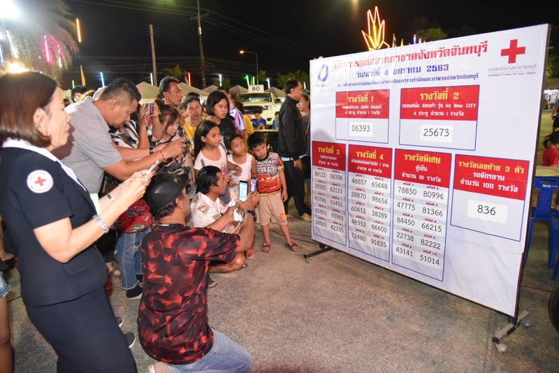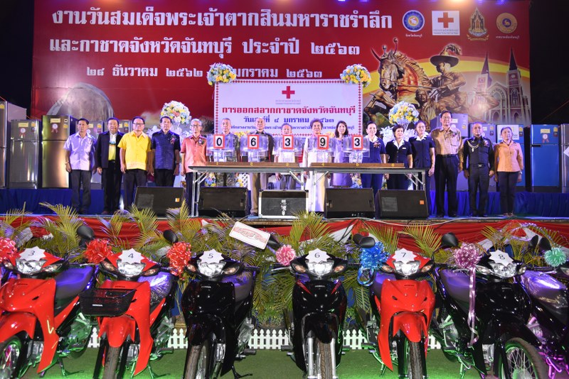 ค่ำวันนี้ ( 4 ม.ค.63 ) ที่เวทีกลางงานวันสมเด็จพระเจ้าตากสินมหาราชรำลึกและกาชาดจังหวัดจันทบุรี ประจำปี 2563 สวนสาธารณเฉลิมพระเกียรติ ร.๙ พระยืน สำนักงานเหล่ากาชาดจังหวัดจันทบุรีได้ออกรางวัลสลากกาชาดสาธารณกุศล ประจำปี 2563 หารายได้ช่วยเหลือผู้ประสบภัย ผู้ยากไร้ ยากจน ด้อยโอกาสและเพื่อสาธารณะกุศลในจังหวัดจันทบุรีที่เปิดจำหน่ายสลากกาชาดจังหวัดจันทบุรีมาตั้งแต่ต้นเดือนธันวาคม ที่ผ่านมาในราคาใบละ 80 บาท โดยนายวิทูรัช ศรีนาม ผู้ว่าราชการจังหวัดจันทบุรี นำหัวหน้าส่วนราชการ ข้าราชการ ผู้แทนองค์กรภาคเอกชน ประชาชน นักธุรกิจ นักเรียน นักศึกษา และ นักท่องเที่ยวร่วมชมและเป็นสักขีพยานในการออกรางวัล ด้วยวิธีหมุนวงล้อ ซึ่งผลการออกรางวัล ปรากฏว่า