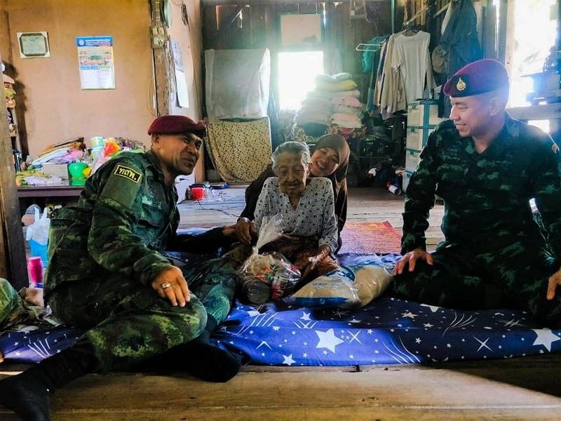 รอยยิ้มของผู้รับ สร้างความสุขใจแก่ผู้ให้ ชุดทักษิณสัมพันธ์ หน่วยเฉพาะกิจสันติสุข เข้าเยี่ยมเยียนให้กำลังใจ และมอบสิ่งของพระราชทานให้กับคุณยายแมะซง สะมะแอ อายุ ๙๐ ปี ผู้สูงอายุ และมีฐานะค่อนข้างยากจน ณ บ้านเลขที่ ๖๑ ต.บางนาค อ.เมือง จ.นราธิวาส