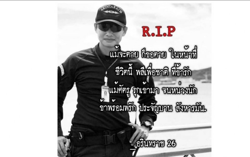 R.I.P. แม้จะตาย ก็ขอตาย ในหน้าที่ ชีวิตนี้ พลีเพื่อชาติ ที่ข้ารัก แม้ศัตรู รุกเข้ามา จนหน่วงหนัก ข้าพร้อมพรัก ประจัญบาน สังหารมัน “อรินทราช 26”