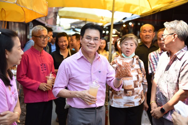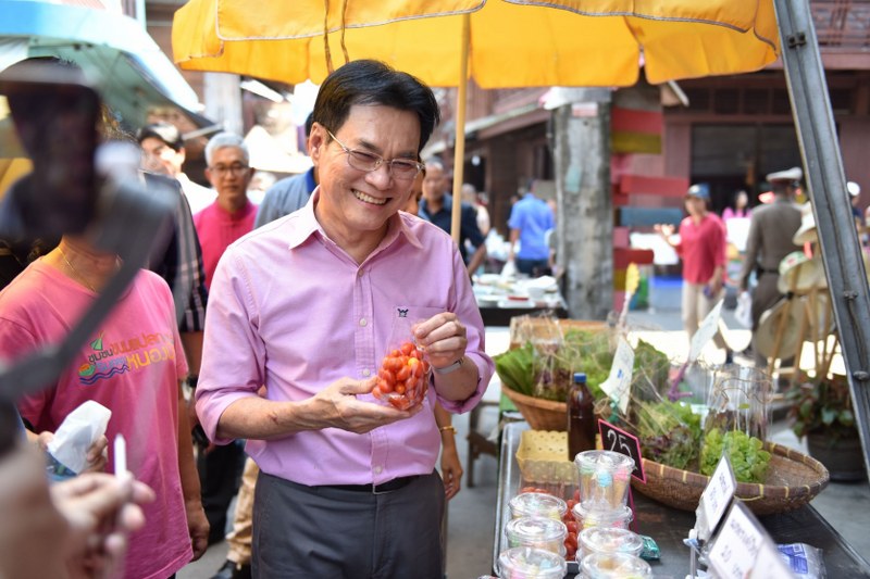 “วันนี้เจอนักท่องเที่ยวจากหลายภูมิภาคทั่วประเทศทั้งจากภาคเหนือภาคอีสาน ถือว่าเป็นตลาดระดับประเทศและนักท่องเที่ยวชาวต่างชาติก็มาที่นี่ เริ่มต้นจากผู้ผลิตจำหน่ายอาหาร ทำอาหารท้องถิ่นขายจำนวน 14 ราย รวมตัวกันเมื่อ 4-5 ปี ที่แล้วและขยายจนเป็น 120 แผงร้านค้าแล้วมีอาหารหลายชนิดที่เป็นอาหารแปลกดึงดูดนักท่องเที่ยว เช่น อาหารที่ดังที่สุดชื่อค่อนข้างแปลก และขนมก็แปลกขนมเหมือนแป้งปั้นเป็นรูปไข่ยาวคลุกกับมะพร้าวและน้ำตาลงาดำอร่อยมาก ถือว่าเป็นไฮไลท์ของที่นี่ดึงดูดทุกคนให้มาที่มี รวมทั้งร้านก๋วยเตี๋ยวน้ำกุ้ง ที่นี่นำเส้นใหญ่ไปผัดจนหอมกับน้ำมันหมูแล้วนำน้ำราดได้รสชาติอีกแบบหนึ่ง มีทั้งกลิ่นไหม้ของก๋วยเตี๋ยวและน้ำที่อร่อยและอื่นๆอีกเยอะครับ” นายจุรินทร์ กล่าว