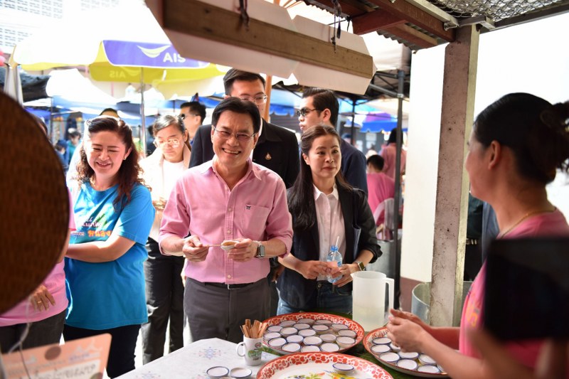 รองนายกรัฐมนตรี และรัฐมนตรีว่าการกระทรวงพาณิชย์เยี่ยมชมและติดตามสถานการณ์ราคาสินค้า พบประทั้งนักท่องเที่ยวที่จับจ่ายซื้อของที่ตลาดชุมชนขนมแปลกริมคลองหนองบัว