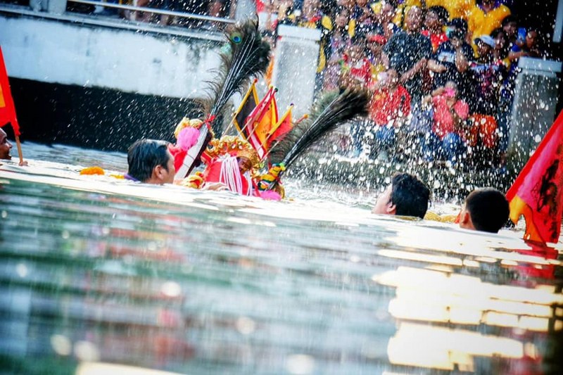 โดยเวลา 07.00 น. องค์เจ้าแม่ลิ้มกอเหนี่ยวได้อัญเชิญมาถึงบริเวณสะพานเดชานุชิต และทำพิธีข้ามแม่น้ำปัตตานี รวม 5 รอบ เพื่อระลึกถึงเจ้าแม่ลิ้มกอเหนี่ยว ที่ข้ามน้ำข้ามทะเลมาจากเมืองจีน สร้างความตื่นตา ตื่นใจให้แก่ผู้ที่มาร่วมชมนับพันคน ภายหลังทำพิธีลุยน้ำเสร็จสิ้นแล้ว องค์พระทั้งหมดจะไปรวมกันที่บริเวณหน้าศาลเจ้าเล่งจูเกียง เพื่อทำพิธีเดินลุยไฟขององค์พระในช่วงเย็นต่อไป