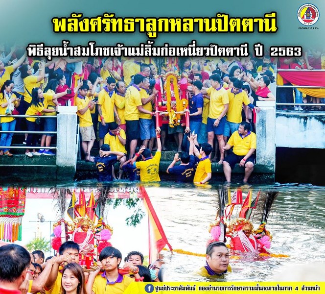 วันนี้ (8 ก.พ. 63 ) เวลา 06.00 น. บรรยากาศพิธีลุยน้ำ งานมหกรรมท่องเที่ยวปัตตานีอาเซียน กตัญญูคู่ฟ้า มหาสมโภชเจ้าแม่ลิ้มก่อเหนี่ยวปัตตานี บริเวณสะพานเดชานุชิต ริมแม่น้ำปัตตานี ประชาชนและนักท่องเที่ยวต่างเดินทางมาชมพิธีลุยน้ำเป็นจำนวนมาก โดยตั้งแต่ช่วงเช้าได้มีการอัญเชิญองค์พระต่าง ๆ จำนวน 25 องค์ แห่ไปตามถนนเพื่อให้ประชาชน นักท่องเที่ยว ตลอดจนผู้เลื่อมใสศรัทธาได้สักการะบูชาเพื่อความเป็นสิริมงคล