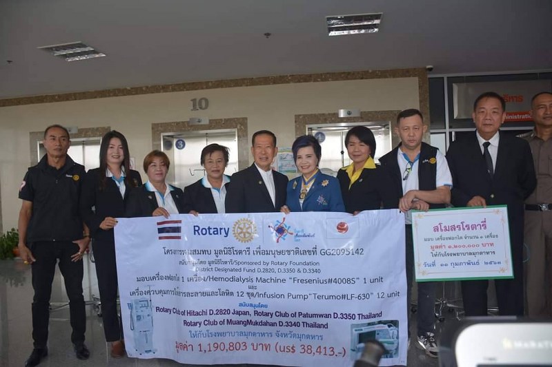 เมื่อวันที่ 11 กุมภาพันธ์ 2563 เวลา 10.00 น ณ โรงพยาบาลมุกดาหาร อาคาร 58 พรรษา เฉลิมราชกุมารี นายมารวย จินตบัณฑิตวงค์ ผู้ว่าการภาค 3340 โรตารีสากล นางมณีรัตน์ นวกุลกาญจนภาส นายกสโมสรโรตารีเมืองมุกดาหาร นายศิริ เอี่ยมจำรูญลาภ อดีตผู้ว่าการภาค 3340 โรตารีสากล พร้อมด้วยคณะกรรมการบริหารสโมสรโรตารีเมืองมุกดาหาร และ พ.ต.อ. นำชัย ศรีเวียง ผกก.สภ.ผึ่งแดด มอบเครื่องฟอกไต Hemodialysis Machine “Fresenius #4008S” จำนวน 1 เครื่อง และเครื่องควบคุมการให้สารละลายและโลหิต Infusion Pump “Termo#LF -630” จำนวน 12 ชุด มูลค่า 1,190,803 บาท ให้กับทางโรงพยาบาลมุกดาหาร โดยมีนายแพทย์ บัญชา ผลานุวงค์ ผู้อำนวยการโรงพยาบาลมุกดาหาร และเจ้าหน้าที่ให้การรับมอบเครื่องมือแพทย์ในครั้งนี้