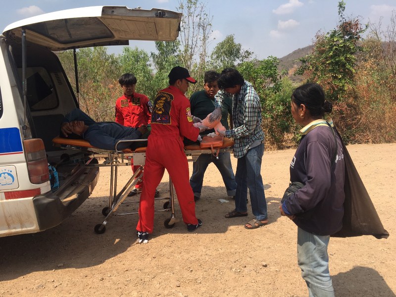 ระหว่างเดินทางไปรับผู้ป่วย ได้มีรถไถสวนทางมาพร้อมกับผู้ที่ได้รับบาดเจ็บ จึงได้ทำการปฐมพยาบาลในเบื้องต้น พบผู้บาดเจ็บที่เท้าขวาฉีกขาดเป็นแผลฉกรรจ์ นิ้วเท้าหลุดหายทั้ง 5 นิ้ว และบริเวณหัวเข่าขวามีรอยเจาะเลือดไหลซึม สอบถามทราบชื่อนายชิต ยงยุทธ์ อายุ 44 ปี อยู่บ้านเลขที่ 69/5 หมู่ที่ 8 ต.สระโบสถ์ อ.สระโบสถ์ ลพบุรี ซึ่งกล่าวว่า ตนเองพร้อมครอบครัวได้มารับจ้างขุดมันที่ตีนเขาคุ้งมรกง ตั้งแต่เช้า โดยใช้เหล็กงัดมัน สำหรับดึงหัวมันขึ้นมาจากดิน เมื่อมาถึงจุดที่เกิดเหตุ ได้พยายามดึงหัวมันที่ติดแน่นใต้ดิน โดยใช้เท้าขวาเหยียบปลายเหล็กเพื่อผ่อนแรง จนหลุดพ้นดิน พร้อมกับเสียงระเบิดที่ดังสนั่นกึกก้อง จนตนเองหูอื้อ ตาพร่ามัวจากเศษดินกระเด็นเข้าตา รู้สึกชาที่ปลายเท้าขวา และหัวเข่า เมื่อลืมตาได้พบว่าเท้าขวาตนเองขาดหายไปแล้ว ซึ่งเพื่อนร่วมงานเมื่อได้ยินเสียงระเบิดต่างหาที่หลบกันจ้าละหวั่น จนเมื่อเหตุการณ์สงบจึงได้เข้าช่วยเหลือนายชิต ที่ได้รับบาดเจ็บสาหัส รีบนำตัวส่ง รพ.โคกสำโรง