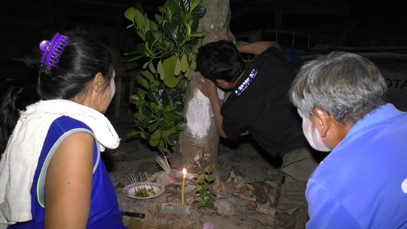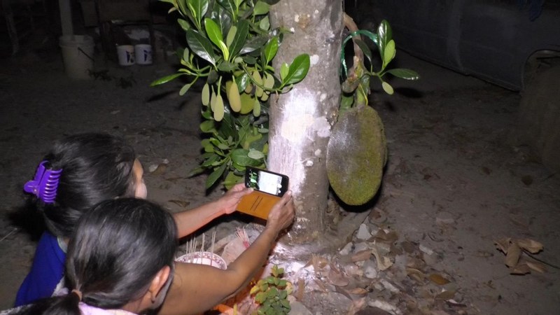 จึงเดินทางไปตรวจสอบ ที่บริเวณหลังบ้านเลขที่ 33 หมู่ 7 บ้านวังไทรทอง ต.ซับเปิบ อ.วังโป่ง จ.เพชรบูรณ์ พบกับ นางละออ ฤทธิชัย อายุ 59 ปี เจ้าของบ้าน พร้อมด้วยเพื่อนบ้านนับ10 ราย ต่างกำลังนำดอกไม้ ธูปเทียน พร้อมเครื่องเซ่นไหว้ แต่งขันธ์ 5 ประกอบพิธีขอหวยตามความเชื่อโบราณ ที่ใต้ต้นขนุนขนาดใหญ่ ความสูงราว 12 เมตร อายุกว่า 30 ปี พร้อมทั้งใช้แป้งฝุ่นลูบเบาๆที่โคนต้น และใช้แสงไฟส่องหาตัวเลข บางคนก็นำโทรศัพท์มือถือขึ้นมาถ่ายรูป หรือเปิดกล้องส่องหาตัวเลข โดยส่วนใหญ่เห็นคล้ายกัน ได้เลข 5 1 และใกล้เคียง ต่างจดใส่กระดาษ หวังนำไปเสี่ยงโชคเสี่ยงดวง ในช่วงโค้งสุดท้ายก่อนหวยออก ต่อไป