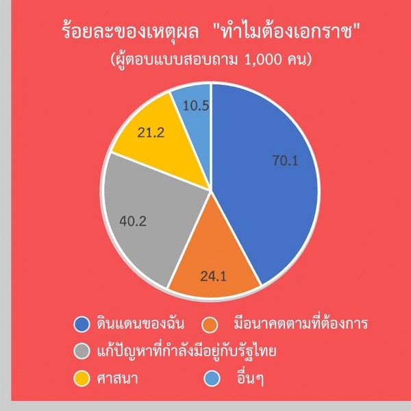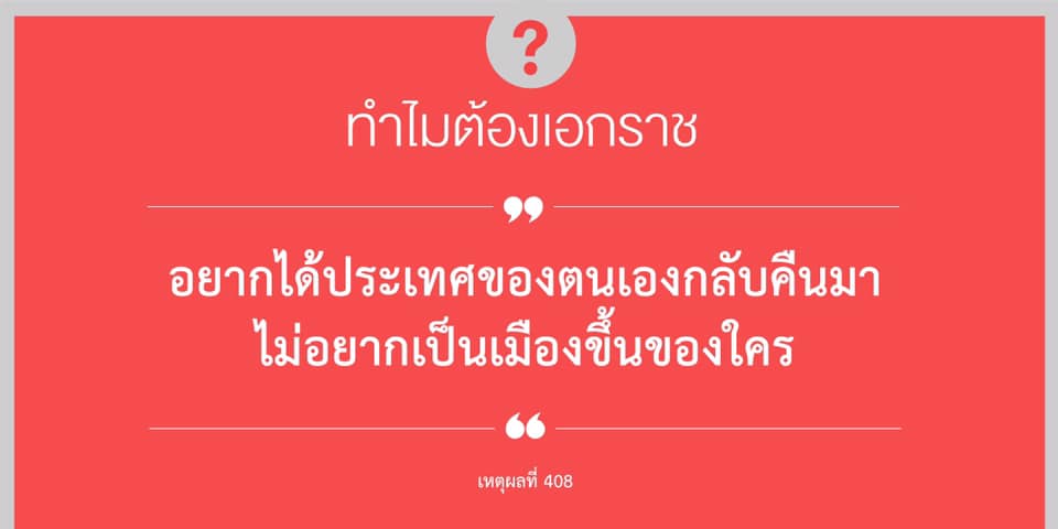 ” อยากได้ประเทศของตนเองกลับคืนมา ไม่อยากเป็นเมืองขึ้นของใคร ” เหตุผลที่ 408 จากผู้ให้สัมภาษณ์ 1,000 คน ว่าทำไมสำหรับเขาคำตอบคือ เอกราช เท่านั้น