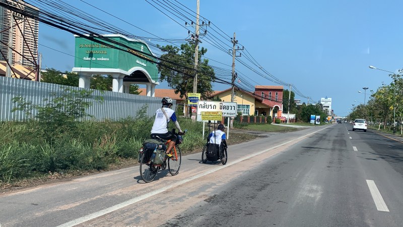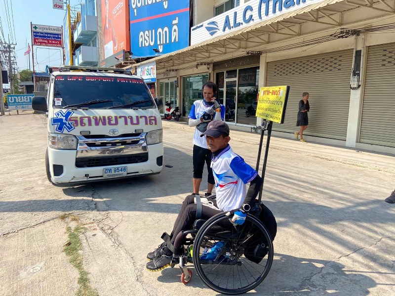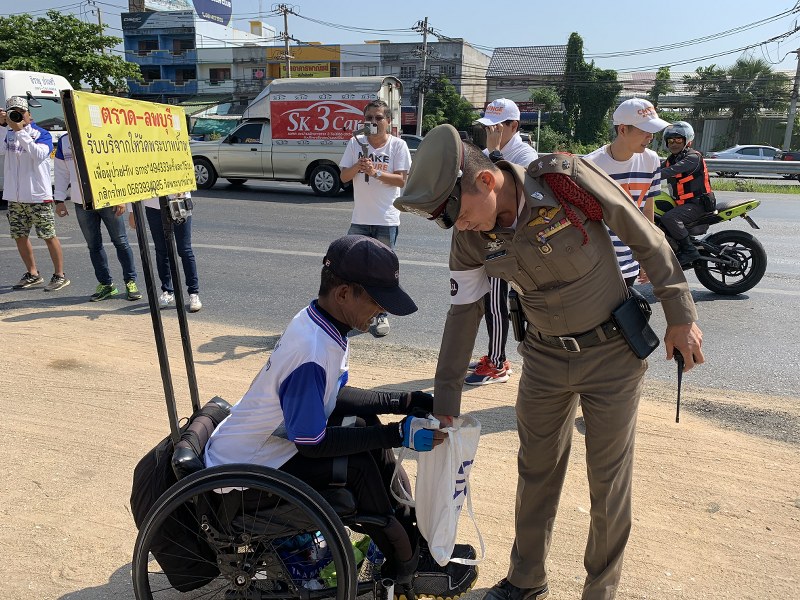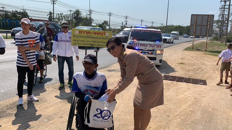ช่วงเช้าของวันนี้ 17 ก.พ.63 บนถนนสุขุมวิท ขาเข้าพัทยา ต.นาจอมเทียน อ.สัตหีบ จ.ชลบุรี พบนายสาธิต จันทะรังสี อายุ 57 ปี ได้ปั่นรถวีลแชร์ พร้อมป้ายติดหลังรถวีลแชร์ว่า “ตราด-ลพบุรี รับบริจาคให้วัดพระบาทน้ำพุ เพื่อผู้ป่วย HIV SMS *494333 ครั้งละ15บาท กสิกรไทย วัดพระบาทน้ำพุเลขบัญชี 0563934085 วัดพระบาทน้ำพุ” โดยมีนายกำพล เทพประดิษฐ์ อายุ 50 ปี ปั่นจักรยานตามหลัง บนถนนที่เต็มไปด้วยรถยนต์ที่วิ่งกันจำนวนมาก ท่ามกลางแสงแดดที่ร้อนระอุ โดยมี เจ้าหน้าที่ตำรวจ สภ.นาจอมเทียน และ เจ้าหน้าที่กู้ภัยมูลนิธิสว่างบริบูรณ์เมืองพัทยา คอยอำนวยความสะดวกตลอดเส้นทาง
