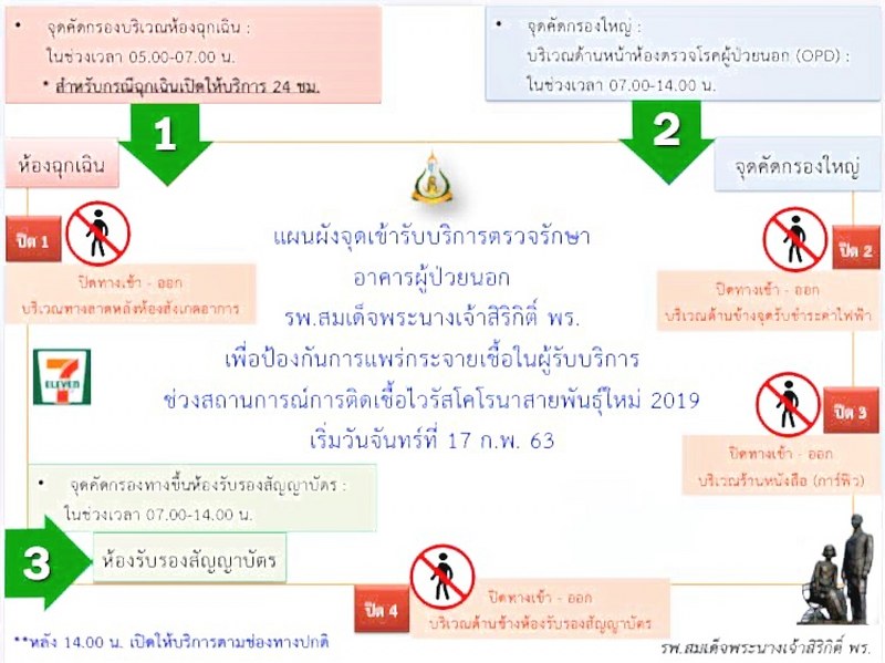 ในวันนี้ 17 ก.พ.63 พลเรือตรี เกิดศักดิ์ วีระโยธิน ผอ.โรงพยาบาลสมเด็จพระนางเจ้าสิริกิติ์ ฯ ได้มอบหมายให้ นาวาเอกนายแพทย์ ณัฐศักดิ์ วรเจริญศรี ประธานควบคุมและป้องกันการติดเชื้อ ในโรงพยาบาลฯ เปิดเผยถึงวิธีการชะลอและป้องกันการแพร่ระบาดของโรค โดยเน้นการคัดกรอง ด้วยการปิดช่องทางการเข้า-ออก อาคารผู้ป่วยจากที่มีหลายช่องทางให้เหลือเพียง 3 ช่องทาง บุคคลากรของโรงพยาบาลและผู้มาใช้บริการจะต้องผ่านจุดคัดกรองนี้ทั้งสิ้น