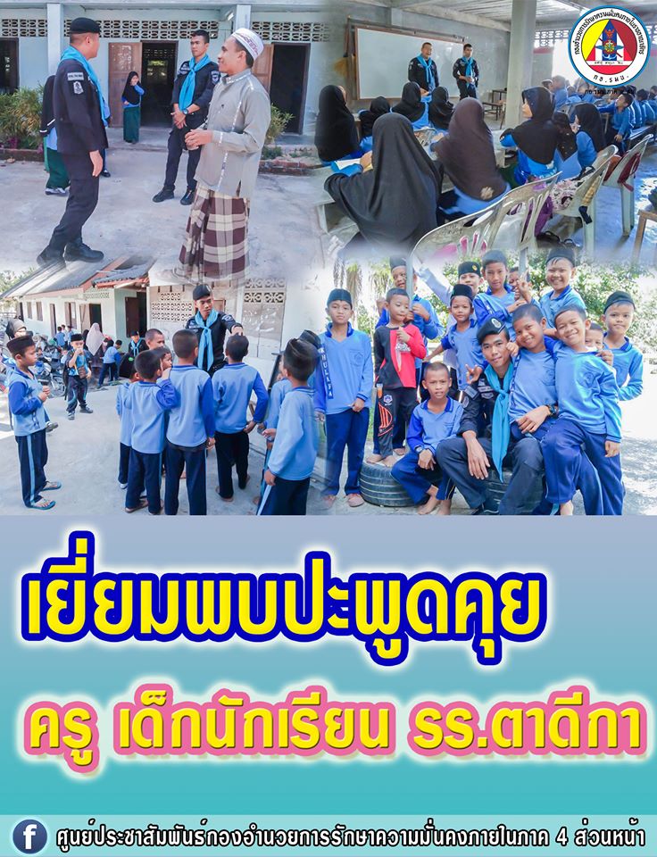 เมื่อวันที่ 16 กุมภาพันธ์ 2563 เวลา 10.00 น. จ่าสิบเอกสมภพ อินทมุสิก หัวหน้าชุดปฏิบัติการกิจการพลเรือนกองร้อยทหารพรานที่ 4205 พร้อม กำลังพลชุดปฏิบัติการกิจการพลเรือน เข้าพบปะเยี่ยมเยียนพูดคุยกับครู และนักเรียน โรงเรียนตาดีกาบ้านมาโง๊ะฮ หมู่ที่ 2 ตำบลปะโด อำเภอมายอ จังหวัดปัตตานี เพื่อสร้างสัมพันธ์อันดีระหว่างเจ้าหน้าที่รัฐกับเยาวชนในพื้นที่ พร้อมทั้ง สอบถามความเป็นอยู่ การเรียนการสอน และได้แนะนำการดูแลสุขภาพให้ความรู้เกี่ยวกับพิษภัยของยาเสพติด สามารถสร้างภูมิคุ้มกันที่ดี ให้แก่เด็กและเยาวชน มีจิตสำนึก ไม่เข้าไปยุ่งเกี่ยวกับยาเสพติด เป็นเยาวชนที่มีคุณภาพในอนาคตต่อไป ซึ่งประชาชนในพื้นที่ให้การต้อนรับพูดคุยเป็นอย่างดี