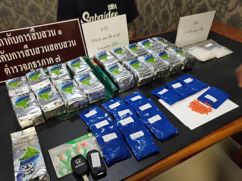 - นายธนพัฒน์ โพธิ์ทอง อายุ 28 ปี พร้อมด้วยของกลางยาเสพติด ยาบ้า จำนวน 18 มัด จำนวน 38,800 เม็ด และ ยาไอซ์ จำนวน 4 ถุง รวมน้ำหนัก 150 กรัม