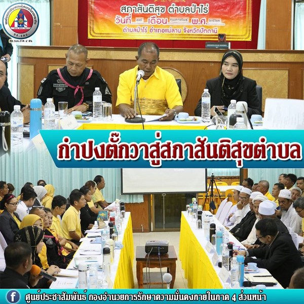 เมื่อวันที่ 18 กุมภาพันธ์ 2563 เวลา 9.00 น. ที่ ห้องประชุมองค์การบริหารส่วนตำบลป่าไร่ อำเภอแม่ลาน จังหวัดปัตตานี ศูนย์สันติวิธี กองอำนวยการรักษาความมั่นคงภายในภาค 4 ส่วนหน้า จัดกิจกรรมขยายผลกำปงตักวาสู่สภาสันติสุขตําบล ประจำเดือนกุมภาพันธ์ 2563 โดยมีนายสมมาตร บารา นายอำเภอแม่ลาน เป็นประธานพร้อมด้วย คณะทำงานศูนย์สันติวิธี กองอำนวยการรักษาความมั่นคงภายในภาค 4 ส่วนหน้า, นายอารี ปาเต๊ะ กำนันตำบลป่าไร่/ประธานสภาสันติสุขตำบลป่าไร่, กองร้อยเฉพาะกิจทหารพรานที่ 2205 หน่วยเฉพาะกิจกรมทหารพรานที่ 22,ผู้นำท้องถิ่น, ผู้บริหารสถานศึกษาในพื้นที่, ผู้นำศาสนา, หน่วยแพทย์ในพื้นที่ และประชาชนในพื้นที่เข้าร่วมกิจกรรม