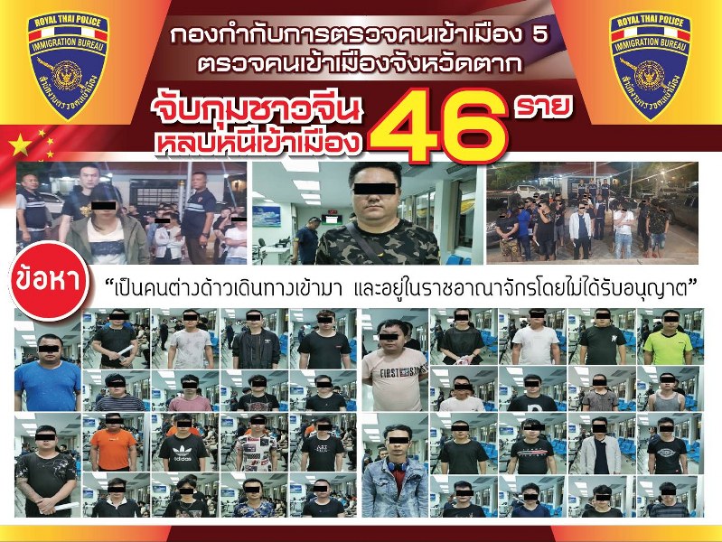 ตม.จ.ตาก จับกุมคนจีน 46 คน เป็นคนต่างด้าวเดินทางเข้ามา และอยู่ในราชอาณาจักรโดยไม่ได้รับอนุญาต