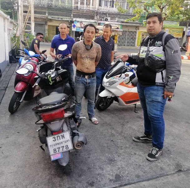 พ.ต.ต.ภราดร กล่าวว่า การจับกุมครั้งนี้สืบเนื่องจากเมื่อช่วงบ่ายที่ผ่านมา ขณะที่ นายชัยรัตน์ ปรีชาบูรณะ อายุ 32 ปี อาชีพพนักงานบริษัทจอดรถ จยย.แวะนั่งดื่มกาแฟอยู่ที่หน้าร้านจุดเกิดเหตุ โดยดึงกุญแจรถออกจากเบ้าแล้วแต่ไม่ได้ล็อกคอ จากนั้นเมื่อกำลังจะเดินทางกลับ พบว่ารถของตัวเองหายไป จึงเข้าเเจ้งความกับฝ่ายสืบสวน สน.บางขุนเทียน จากนั้นตนจึงสั่งการให้ ร.ต.อ.ธนาวุฒิ อินตา และ ร.ต.อ.ยศกร สัตถาวะโห รอง สว.สส.สน.บางขุนเทียน นำกำลังออกไปตรวจสอบกล้องวงจรปิดในละเเวกที่เกิดเหตุ พบภาพคนร้ายรายนี้ จูงรถของกลางคันดังกล่าวไปมาบนถนนเอกชัย ในลักษณะคล้ายคนมีอาการหลอนยา จึงติดตามไปรวบตัวไว้ได้ขณะนั่งคร่อมรถ จยย.ของผู้เสียหายพูดจาคนเดียวในปั๊มน้ำมันแห่งหนึ่งใกล้ซอยเอกชัย 11 ห่างจากจุดก่อเหตุประมาณเกือบ 2 กิโลเมตร