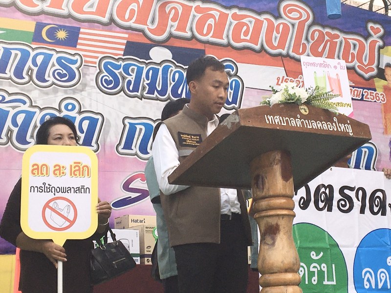 บริเวณหน้าตลาดสดเทศบาลตําบลคลองใหญ่ และถนนคนเดิน นายพงษ์พัฑฒ์ สินราย ปลัดอาวุโสอําเภอคลองใหญ่ รักษาการแทนนายอําเภอคลองใหญ่ เป็นประธานในพิธีเปิด กิจ กรรมทําความดีด้วยหัวใจ ลดรับ ลดให้ ลดใช้ถุงพลาสติก พร้อมด้วย นางสาวกัญญารัตน์ กลางบุรีมย์ ผู้อํานวยการส่วนสิ่งแวดล้อม สำนักงานทรัพยากรธรรมชาติและสิ่งแวดล้อม จังหวัดตราด กล่าวรายงานถึงวัตถุประสงค์ ในปัจจุบัน มีการนําพลาสติกมาใช้ทดแทนผลิตภัณฑ์ชนิดอื่นมากขึ้น จึงทําให้ผลิตภัณฑ์จากพาลสติกกลายเป็นที่นิยมอย่างรวดเร็วจนในที่สุดพลาสติกก็เข้ามาเป็นส่วนหนึ่งในชีวิตประจําวันของเราทุกคน สําหรับประเทศไทยจากตัวเลขของ กรมควบคุมมลพิษ พบว่าประเทศไทยมีปริมาณขยะพลาสติกและโฟมมากถึง ๒.๗ ล้านตัน หรือเฉลี่ย ๗.000 ตันต่อวัน แบ่งเป็นถุงพลาสติก ๕.๓000 ตันต่อวัน พลาสติกเหล่านี้จะถูกทิ้งเป็นขยะมูลฝอยและถูกนําไปฝังกลบรวมกับขยะมูลฝอยอื่นๆซึ่งต้องการใช้เวลาในการย่อยสลายนับร้อยๆปี
