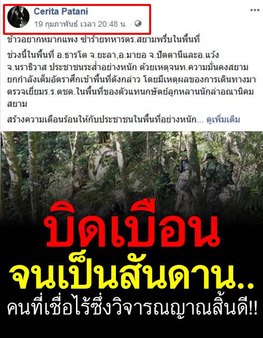 เอาเป็นว่าเรื่องที่มีการบิดเบือนปลุกระดมมุสลิมในพื้นที่ว่าทหารไปสร้างความเดือดร้อนให้กับชาวบ้านในพื้นที่นั้น สรุปสั้นๆไม่เป็นความจริงอย่างที่ทางเพจได้กล่าวอ้าง ทหารเข้าพื้นที่เพื่อดูแลความปลอดภัยของประชาชนมากกว่าการไปสร้างความเดือดร้อน มีแต่เพจแนวร่วมเท่านั้นที่พยายามสร้างความแตกแยกในพื้นที่