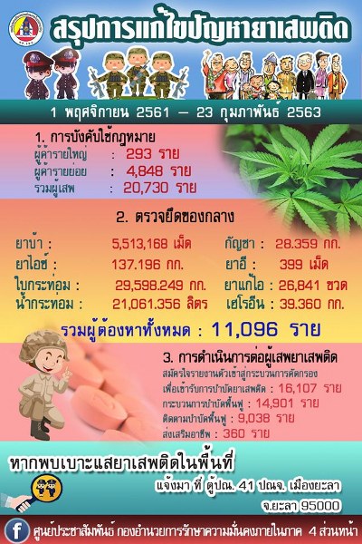 เมื่อวันที่ (23 กุมภาพันธ์ 2563) กองอำนวยการรักษาความมั่นคงภายในภาค 4 ส่วนหน้า สรุปผลการปฏิบัติงานการแก้ไขปัญหายาเสพติดในพื้นที่จังหวัดชายแดนภาคใต้ ของศูนย์ปฏิบัติการร่วมอำเภอ 37 อำเภอ (ศปร.อ. 37 อำเภอ) ตั้งแต่ (1 พฤศจิกายน 2561 – 23 กุมภาพันธ์ 2563 ดังนี้