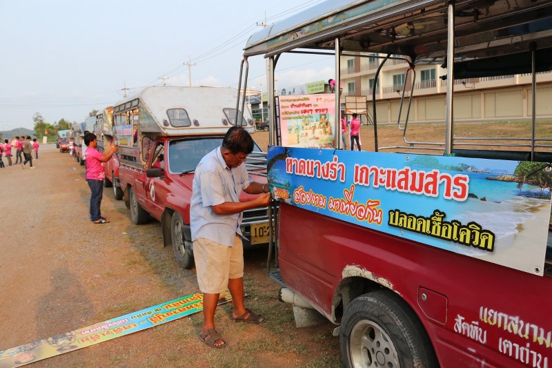 ไวรัสโควิด-19 พ่นพิษเศรษฐกิจทรุด เจ้าของหมู่บ้านสัตหีบผนึกกำลังร่วมกลุ่มรถสองแถวติดป้ายเชิญชวนมาเที่ยวสัตหีบ เมืองน่าอยู่ปลอดภัย