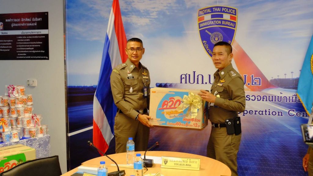 วันนี้ วันอังคารที่ 18 มิ.ย.62 เวลา 10.00 น. ณ ด่าน ตม.ทอ.สุวรรณภูมิ บก.ตม.2 : พลตำรวจโท สมพงษ์ ชิงดวง รักษาราชการแทนผู้บัญชาการสำนักงานตรวจคนเข้าเมือง (รรท.ผบช.สตม.) พร้อมด้วย พลตำรวจตรี สุรพงษ์ ชัยจันทร์ รองผู้บัญชาการตำรวจภูธรภาค 7 (รอง ผบช.ภ.7) ปฏิบัติราชการ กองบัญชาการสำนักงานตรวจคนเข้าเมือง (บช.สตม.) เดินทางไปตรวจเยี่ยมการปฏิบัติหน้าที่ของข้าราชการตำรวจในสังกัดพร้อมมอบสิ่งของบำรุงขวัญและกำลังใจ โดยมี พลตำรวจตรี พฤทธิพงษ์ ประยูรศิริ ผู้บังคับการตรวจคนเข้าเมือง 2 (ผบก.ตม.2) นำข้าราชการในสังกัด บก.ตม.2 ให้การต้อนรับและรอรับการตรวจเยี่ยม