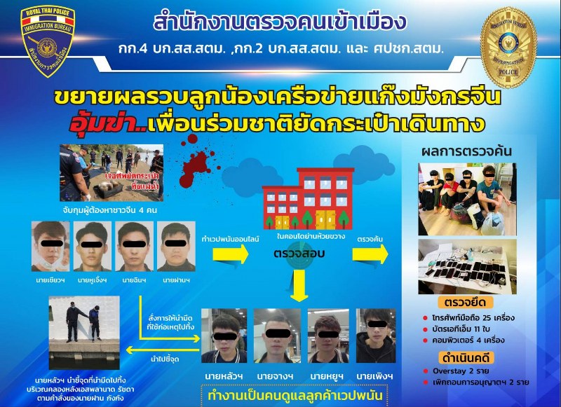 สืบสวน ตม. ขยายผลรวบลูกน้องเครือข่ายแก๊งมังกรจีน อุ้มฆ่าเพื่อนร่วมชาติยัดกระเป๋าเดินทาง