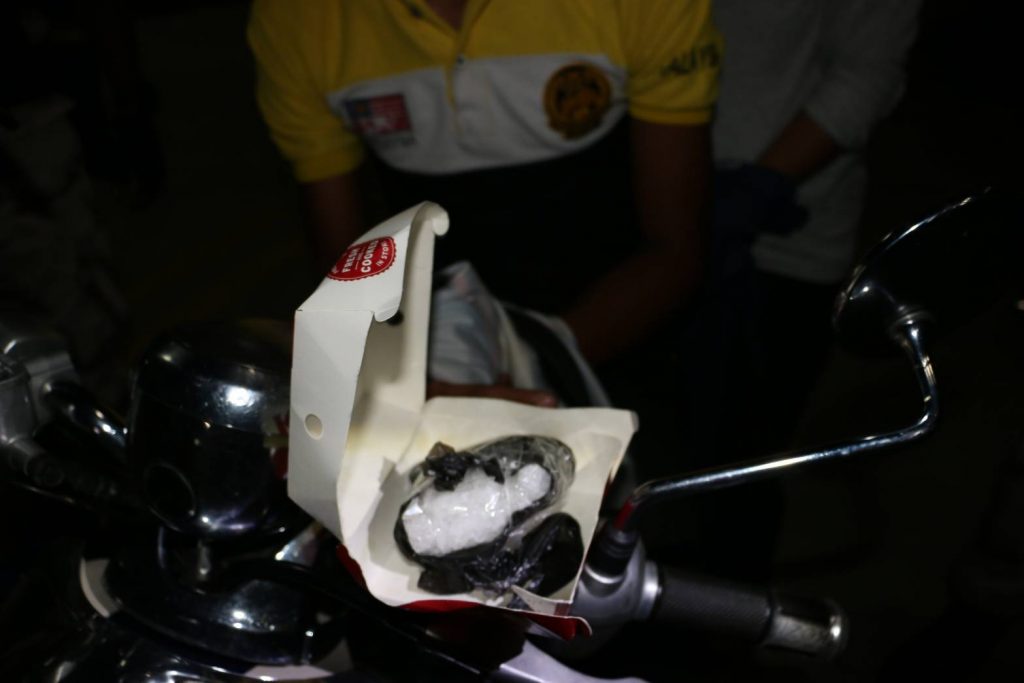 ต่อมาได้มีชาย หญิง ขี่รถจักรยานยนต์ ยี่ห้อยามาฮ่า รุ่นฟีโน่ สีน้ำเงิน-ขาว หมายเลขทะเบียน 1กข 1587 เบตง ผ่านมา ซึ่งตรงตามที่สายลับแจ้งไว้ เจ้าหน้าที่ อส. ชุดที่ซุ่มดู จึงวิทยุแจ้งให้ ปลัดอำเภอและเจ้าหน้าที่ อส. ชุดจับกุม ตั้งจุดตรวจจุดสกัดชั่วคราว บริเวณหน้ากุโบร์ ชุมชนกาแป๊ะกางา ถ.กาแป๊ะกอตอนอก ต.เบตง เพื่อเรียกขอตรวจค้น ทราบชื่อ นายวสันต์ สาแม อายุ 25 ปี อยู่บ้านเลขที่ 9/1 หมู่2 ต.กาบัง อ.กาบัง จ.ยะลา เป็นคนขี่ และมี น.ส.แก้วตา หลงสมบุญ อายุ 24 ปี อยู่บ้านเลขที่ 3/461 หมู่2 ต.คอกกระบือ อ.เมือง จ.สมุทรสาคร นั่งซ้อนท้าย ซึ่งทั้งสองคน ท่าทางมีพิรุธ ตัวสั่น หน้าซีด ขณะเจ้าหน้าที่เรียกขอตรวจค้น เจ้าหน้าที่ตรวจค้น พบยาไอซ์ 1 ห่อ น้ำหนักประมาณ 100.9 กรัม ห่อหุ้มด้วยถุงพลาสติกสีดำ พันด้วยเทปใส ซุกซ่อนอยู่ในกล่องไก่ KFC แขวนอยู่บริเวณคอรถจักรยานยนต์
