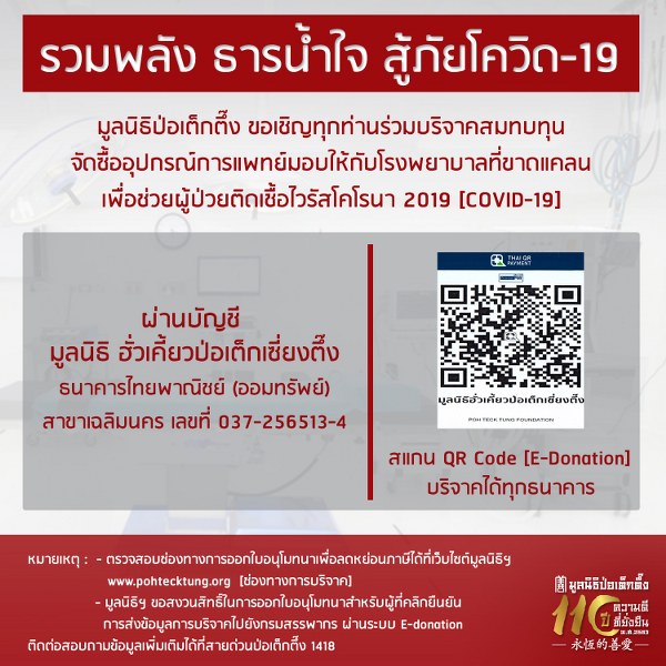 มูลนิธิป่อเต็กตึ๊ง ขอเชิญทุกท่าน ร่วมบริจาคสมทบทุนจัดซื้ออุปกรณ์การแพทย์ มอบให้กับโรงพยาบาลที่ขาดแคลน เพื่อช่วยผู้ป่วยติดเชื้อไวรัสโคโรนา 2019 [COVID-19]