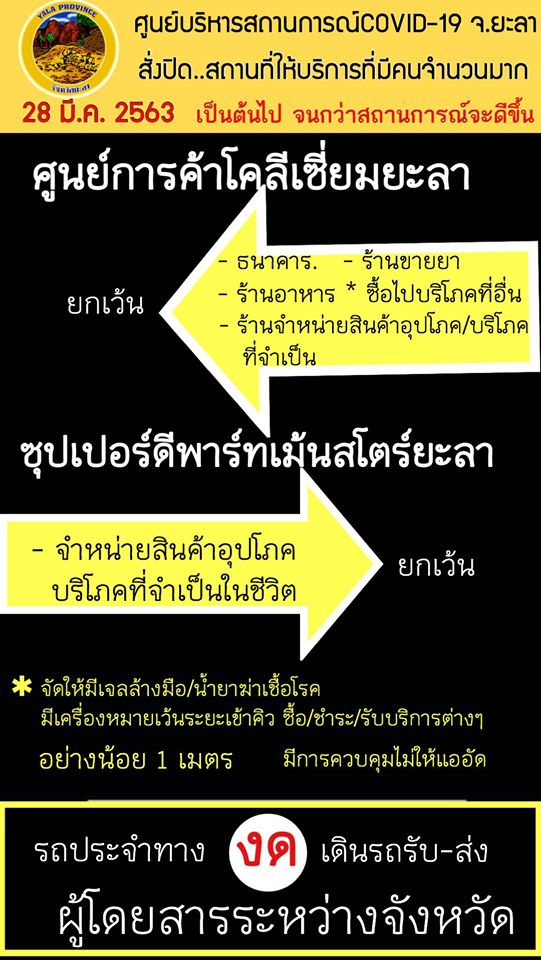 ศูนย์บริหารสถานการณ์ COVID-19 จ.ยะลา สั่งปิด…สถานที่ให้บริการที่มีคนจำนวนมาก 28 มี.ค. 2563 เป็นต้นไป จนกว่าสถานการณ์จะดีขึ้น