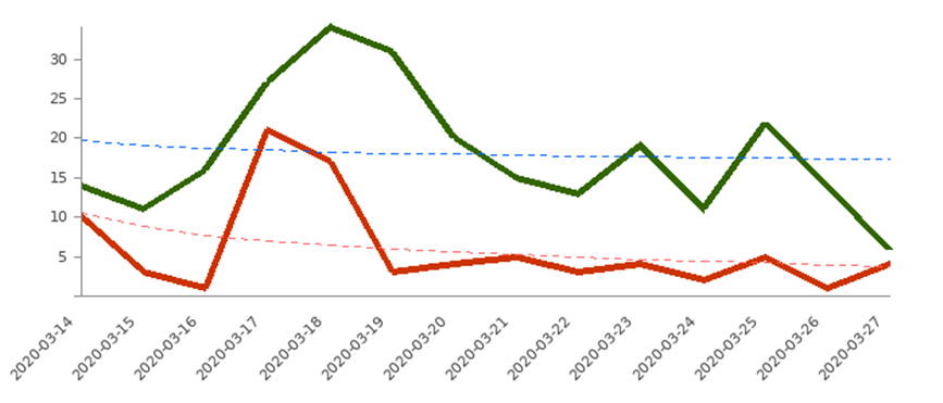 ในช่วงวันที่ ๒๑-๒๗ มี.ค. ๖๓ มีข่าวเชิงบวก (เส้นทึบสีเขียว) ๑๐๐ ข่าว จากที่มี ๑๕๓ ข่าวในสัปดาห์ที่แล้ว (๑๔-๒๐ มี.ค. ๖๓) สำหรับในมิติของแนวโน้มความถี่ (เส้นปะสีน้ำเงิน) มีแนวโน้มฯ ลดลงเล็กน้อย ในส่วนของข่าวเชิงลบที่เกี่ยวข้องกับ จชต. (เส้นทึบสีแดง) มีข่าวเชิงลบ ๒๔ ข่าวในสัปดาห์นี้ จากที่มี ๕๙ ข่าวในสัปดาห์ที่แล้ว (๑๔-๒๐ มี.ค. ๖๓) สำหรับในมิติของแนวโน้มความถี่ (เส้นปะสีแดง) มีแนวโน้มฯ ลดลง