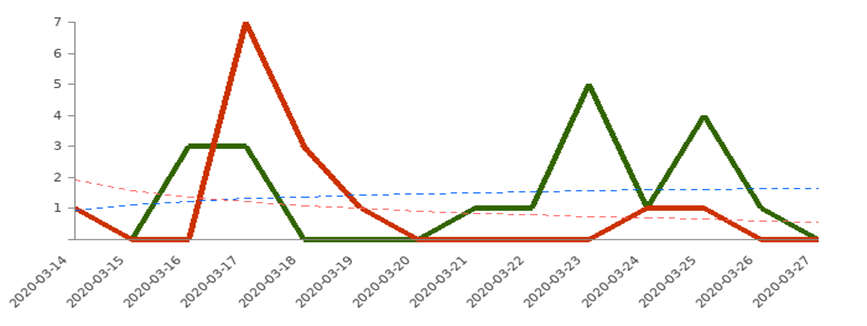ไม่มีข่าวเชิงบวก ทั้งในช่วงวันที่ ๒๑-๒๗ มี.ค. ๖๓ และ ในสัปดาห์ที่แล้ว (๑๔-๒๐ มี.ค. ๖๓) สำหรับในมิติของแนวโน้มความถี่ มีแนวโน้มฯ ต่ำค่อนข้างคงที่ ในส่วนของข่าวเชิงลบที่เกี่ยวข้องกับ จชต. ไม่มีข่าวเชิงลบในสัปดาห์นี้ จากที่มี ๒ ข่าวในสัปดาห์ที่แล้ว (๑๔-๒๐ มี.ค. ๖๓) สำหรับในมิติของแนวโน้มความถี่ (เส้นปะสีแดง) มีแนวโน้มฯ ลดลง