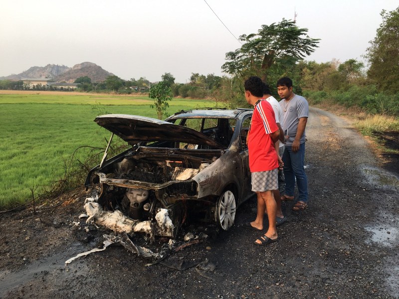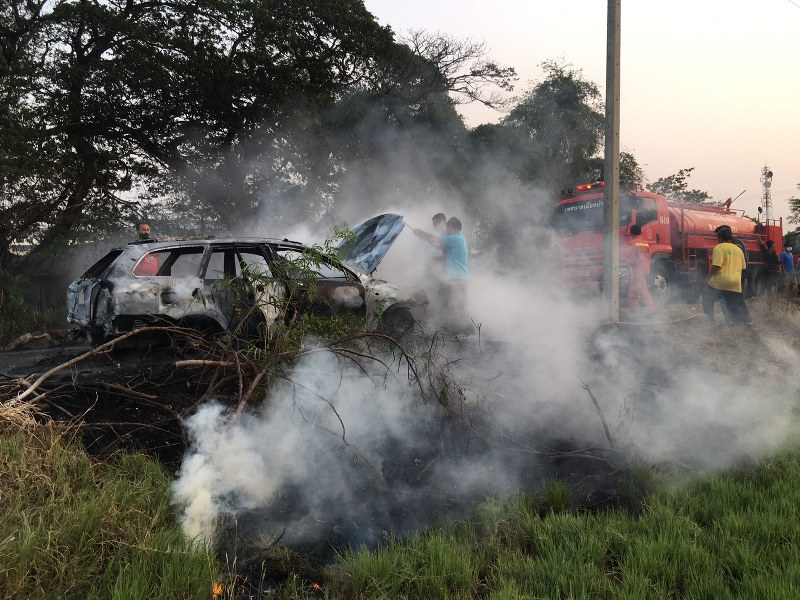 จากการสอบถาม น.ส.วีนา ปัญญาพร อายุ 36 ปี อยู่บ้านเลขที่ 122 หมู่ที่ 6 ต.โพนทอง อ.บ้านหมี่ จ.ลพบุรี ซึ่งอยู่ในอาการตื่นตระหนก เล่าให้เจ้าหน้าที่ฟังในขณะที่รถตนเองกำลังถูกเพลิงโหมลุกไหม้ ก่อนที่รถน้ำดับเพลิงยังมาไม่ถึงที่เกิดเหตุ ว่านายมงคลสุข มากลิ่น อายุ 34 ปี สามีได้ขับรถคันดังกล่าว ออกจากบ้านเพื่อที่จะไปส่งตนทำงาน และสามีก็ไปทำงานเป็นช่างซ่อมรถในตัวเมืองลพบุรี ในขณะที่ขับออกมาได้สักครู่ เครื่องยนต์เกิดดับ สามีจึงได้ลงมาเปิดฝากระโปรงรถดู เห็นว่าสายน้ำมันหลุด จึงได้ทำการซ่อมแซม ก่อนขึ้นมาสตาร์ทรถ จู่ๆ ได้ลุกพรึบที่ใต้ท้องรถ จึงได้เปิดประตูรถวิ่งหนีออกมาได้ ก่อนที่เพลิงจะโหมลุกไหม้อย่างรุนแรง ลุกลามติดหญ้าแห้งริมทาง ซึ่งตนเองและสามีจึงได้โทรแจ้งเจ้าหน้าที่ตำรวจดังกล่าว