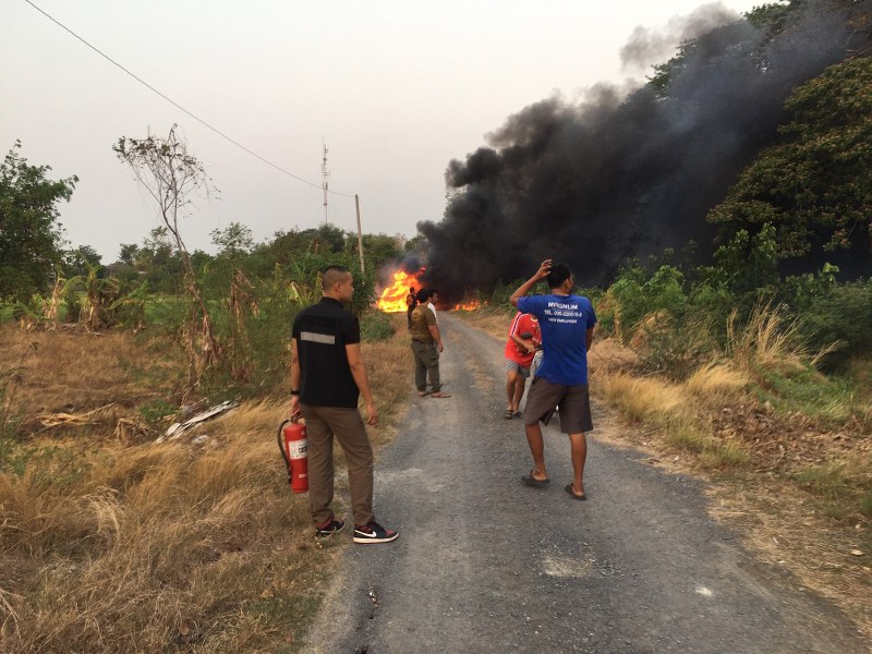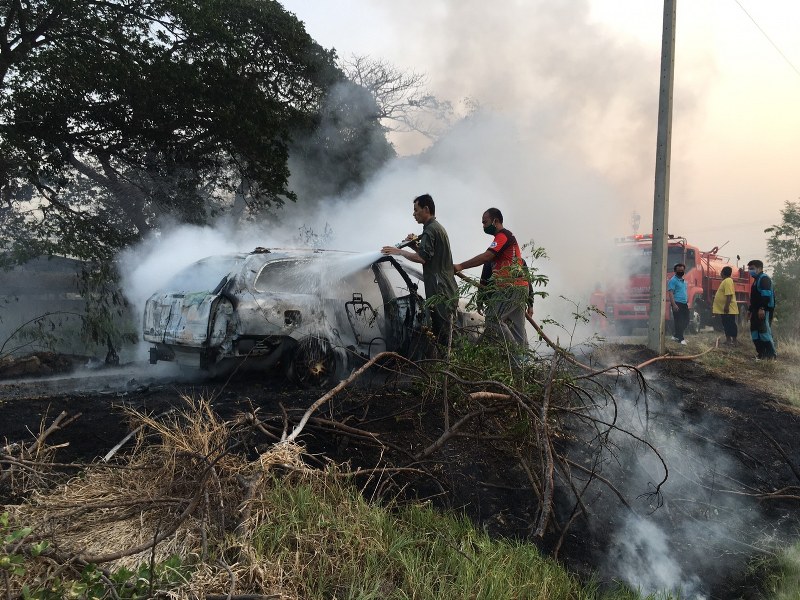 ที่เกิดเหตุพบเพลิงกำลังลุกไหม้รถยนต์เก๋ง ยี่ห้อ เชฟโรเรท สีดำ หมายเลขทะเบียน กบ- 6211 ลพบุรี อย่างรุนแรง จึงได้กันประชาชนออกนอกพื้นที่เกิดเหตุ ซึ่งเกรงรถอาจจะระเบิดได้ เจ้าหน้าที่ดับเพลิงได้ใช้น้ำฉีดเพื่อควบคุมเพลิงไว้ได้ในเวลาต่อมา แต่เพลิงที่ลุกโหมอย่างรุนแรง ประกอบกับมีลมกรรโชกพัดมาอย่างต่อเนื่องทำให้รถถูกเพลิงเผาไหม้วอดไปหมดทั้งคัน