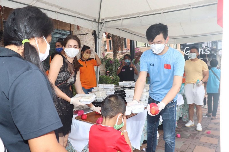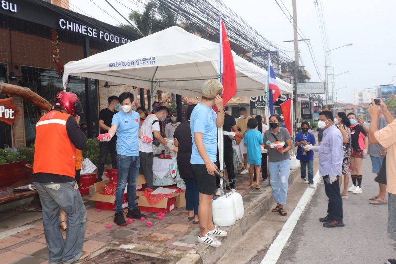 เมื่อเวลา 16.30 น. ของวันที่ 14 เมษายน ที่ร้านอาหาร จีน หม้อไฟหูฉลามลุ่ยเหยียน เลขที่ 306/63 ชาโตเดลพลาซ่า ถ.ทัพพระยา ต.หนองปรือ ก่อนถึงแยกถนนเทพประสิทธิ์ ซึ่งเป็นร้านของ เพื่อนๆพี่ๆน้องๆ ของกลุ่มนักธุรกิจชาวจีน พร้อมนายโยธิน พรมแตง ผู้สื่อข่าว พัทยาและพนักงานในร้าน ช่วยกันทำข้าวกล่อง น้ำดื่ม และขนมหวานจำนวน 1,000 ชุด แจกแก่ ผู้ที่ไม่มีรายได้ ที่ได้รับผลกระทบจากการแพร่ะบาดของเชื้อไวรัสโควิด 19 และผู้ที่สัญจรไปมา บนถนนเส้นดังกล่าว ทั้งชาวไทยและชาวต่างชาติ