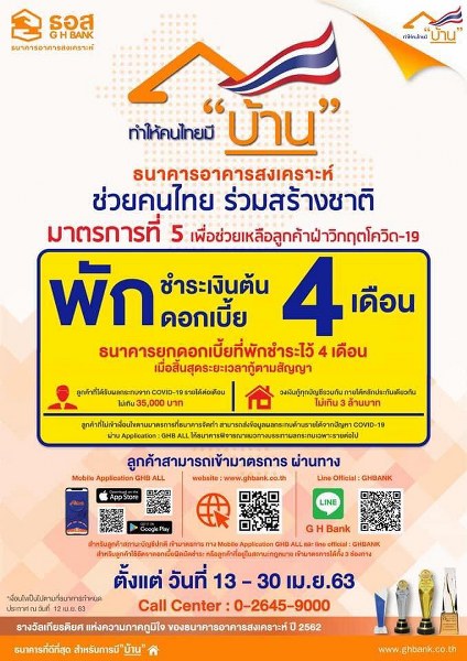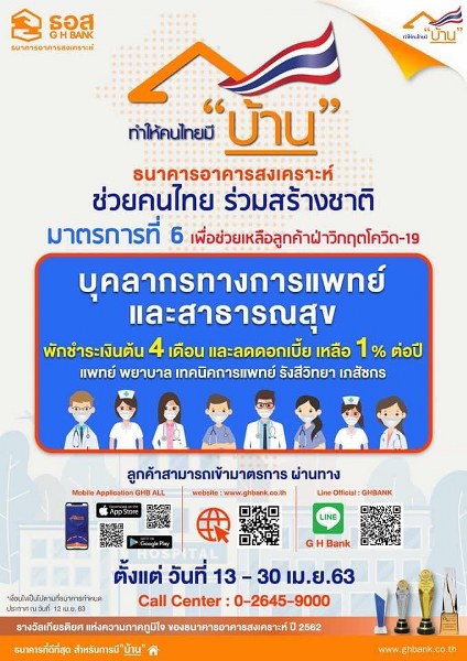 ธนาคารอาคารสงเคราะห์ ประกาศยกระดับความช่วยเหลือเพิ่มเติมให้แก่ลูกค้าของธนาคารที่ได้รับผลกระทบจาก COVID-19 ในมาตรการที่ 5 โดยหลังจากพักชำระเงินต้นและดอกเบี้ยเป็นระยะเวลา 4 เดือนแล้ว ธนาคารจะยกดอกเบี้ยที่พักชำระไว้ทั้ง 4 เดือนให้กับลูกค้า เมื่อสิ้นสุดระยะเวลากู้ตามสัญญา สำหรับกลุ่มลูกค้าทุกวัตถุประสงค์การกู้ที่มีวงเงินกู้ทุกบัญชีรวมกัน ไม่เกิน 3 ล้านบาท และมีรายได้ต่อเดือนไม่เกิน 35,000 บาท ครอบคลุมลูกค้า 1.1 ล้านบัญชี ทั้งสถานะบัญชีปกติ และสถานะบัญชีดอกเบี้ยผิดนัดหรือสถานะกฎหมาย และเตรียมกรอบวงเงิน 10,000 ล้านบาท จัดทำมาตรการที่ 6 พักชำระเงินต้นระยะเวลา 4 เดือน พร้อมลดดอกเบี้ยเหลือ 1.00% ต่อปี สำหรับ “บุคลากรทางการแพทย์และสาธารณสุข” แจ้งความประสงค์ เข้ามาตรการผ่าน Mobile Application : GHB ALL ตั้งแต่วันที่ 13 – 30 เมษายน 2563
