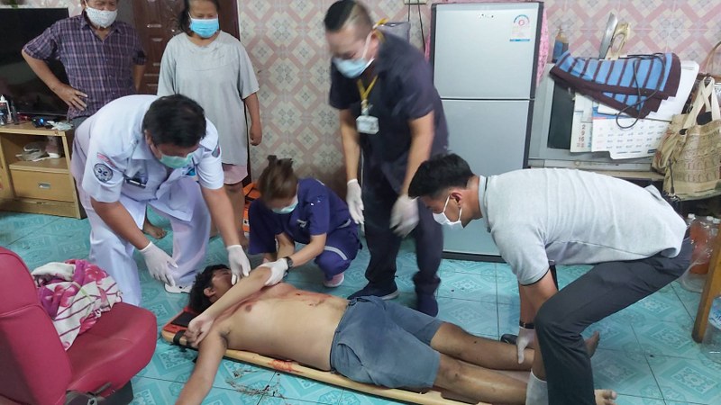 เมื่อเวลา 18.45 น.วันที่ 16 เม.ย.63 ศูนย์ 191 รับแจ้งมีคนแทงตัวเองได้รับบาดเจ็บ ที่บ้านเลขที่ 156 /2 หมู่ 4 ต.บ้านสวน อ.เมือง จ.สุโขทัย จึงประสานไปยัง ร้อยเวร สภ.บ้านสวน และหน่วยกู้ชีพโรงพยาบาลสุโขทัย เจ้าหน้าที่อาสามูลนิธิร่วมกตัญญูสุโขทัย รุดไปยังที่เกิดเหตุ เมื่อไปถึงบ้านที่เกิดเหตุ ภายในบ้าน พบผู้บาดเจ็บชายถูกแทงบริเวณชายโครงซ้าย ทราบชื่อคือนายสานิตย์ ลำภู อายุ 30 ปี ทางเจ้าหน้าที่กู้ชีพโรงพยาบาลสุโขทัยจึงได้ทำการปฐม พยาบาลและนำตัวส่งโรงพยาบาล
