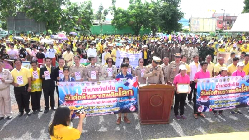นายวรวุฒิ อินตะมะ นายอำเภอวังโป่ง จังหวัดเพชรบูรณ์ ได้เป็นประธานเปิด กิจกรรมรณรงค์เนื่องในวันต่อต้านยาเสพติดโลก ประจำปี 2562 ภายใต้แนวคิดและคำขวัญ “มุ่งมั่น แก้ไข ขจัดภัยยาเสพติด” เบื้องหน้าพระบรมฉายาลักษณ์ พระบาทสมเด็จพระเจ้าอยู่หัวฯ ณ หน้าที่ว่าการอำเภอวังโป่ง โดยศูนย์ปฏิบัติการป้องกันและปราบปรามยาเสพติดอำเภอวังโป่ง ได้กำหนดจัดกิจกรรมรณรงค์ประชาสัมพันธ์เนื่องในวันต่อต้านยาเสพติดโลก ประจำปี 2562 ภายใต้กรอบแนวคิด “มุ่งมั่น แก้ไข ขจัดภัยยาเสพติด”26 มิถุนายน วันต่อต้านยาเสพติดโลก และร่วมแสดงสัญลักษณ์โดยการสวมเสื้อสีเหลือง ในวันต่อต้านยาเสพติดโลก เพื่อให้หมู่บ้านและชุมชน สถานศึกษา องค์กรเยาวชน องค์กรศาสนา สถานประกอบการ หน่วยงานองค์กรภาคีที่เกี่ยวข้อง ทั้งภาครัฐและภาคเอกชนในพื้นที่ ได้รับรู้และเข้าใจถึงโทษ พิษภัยจากยาเสพติด โดยมีนายณัฐพัชร์ ภัทรพิศิษฐ์ ปลัดอาวุโส อำเภอวังโป่ง กล่าวรายงาน พร้อมด้วยหน่วยงานราชการ องค์กร ภาคเอกชน นักเรียน นักศึกษา และประชาชนชาวอำเภอวังโป่ง เข้าร่วมกิจกรรมเป็นจำนวน 2,652 คน