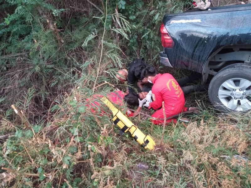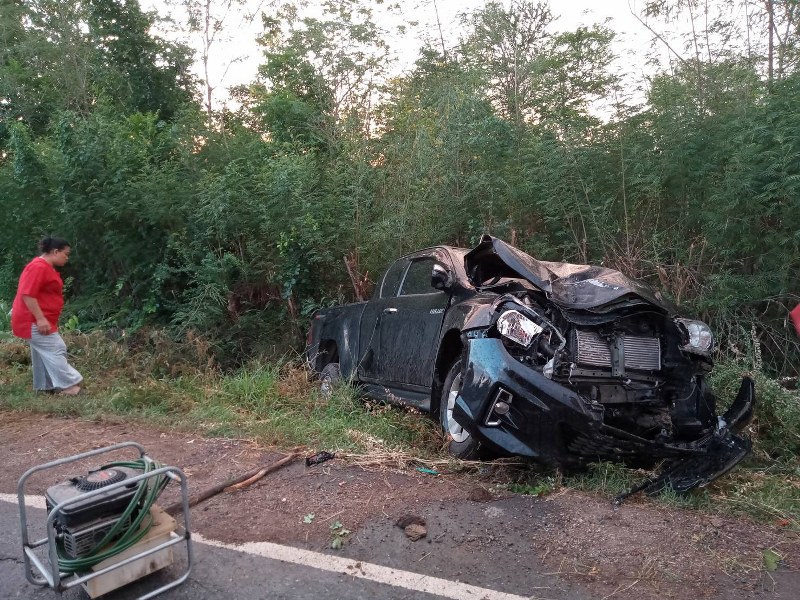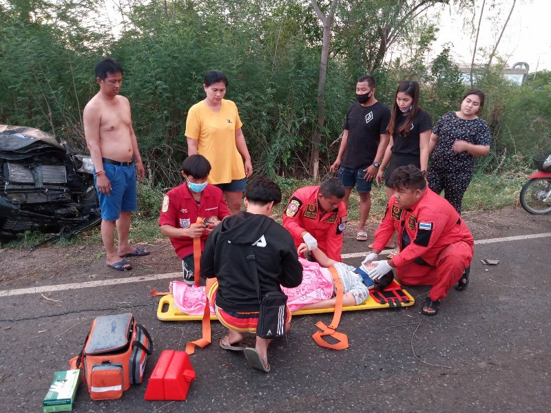 ลพบุรี ฝนตกถนนลื่น กระบะป้ายแดงซิ่งหนีฝนเสียหลักหลุดโค้งเจ็บ 3 ราย