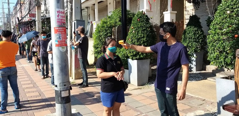 ซึ่งก่อนรับได้เข้าแถวโดยจัดระยะห่างกัน 1 เมตรพร้อมมีการคัดกรองโดยวัดอุณหภูมิร่างกาย มีเจลแอลกอฮอลล้างมือโดยมีเจ้าหน้าที่อาสาตำรวจมาให้คอยดูแลแก่ ผู้ที่มารับข้าวกล่องในครั้งนี้