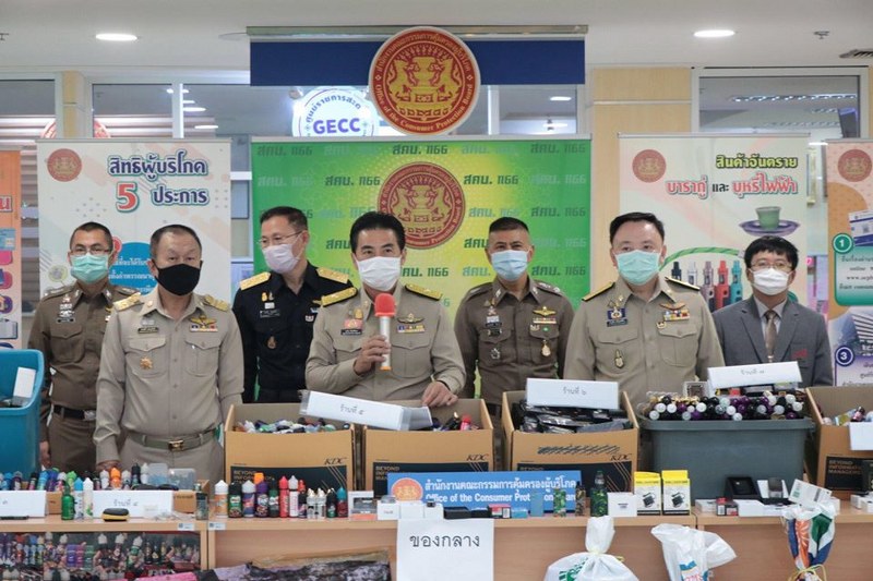 นายเทวัญ ลิปตพัลลภ รัฐมนตรีประจำสำนักนายกรัฐมนตรี พร้อมด้วย นายณัฏฐชัย ศรีรุ่งสุขพินิจ ที่ปรึกษารัฐมนตรีประจำสำนักนายกรัฐมนตรี ร่วมแถลงข่าว กรณีที่ศูนย์ปฏิบัติการพิเศษสำนักงานคณะกรรมการคุ้มครองผู้บริโภค (สคบ.) ลงพื้นที่ตรวจสอบการขายบุหรี่ไฟฟ้าที่ตลาดคลองถม ถนนวรจักร แขวงป้อมปราบ เขตป้อมปราบศัตรูพ่าย กรุงเทพมหานคร เมื่อวันที่ 19 เมษายน 2563 ที่ผ่านมา พบร้านค้าที่ขายบุหรี่ไฟฟ้า น้ำยาสำหรับเติมบุหรี่ไฟฟ้า และอุปกรณ์ที่เกี่ยวข้อง จำนวน 10 ร้าน จึงร่วมกันตรวจยึดของกลางทั้งหมด ประกอบด้วยบุหรี่ไฟฟ้า จำนวน 48 ตัว น้ำยาสำหรับเติมบุหรี่ไฟฟ้า จำนวน 1,703 ขวด คอยล์และอะตอม จำนวน 1,338 ชิ้น อุปกรณ์อื่นที่เกี่ยวข้องกับบุหรี่ไฟฟ้า จำนวน 493 ชิ้น รวมมูลค่าของกลางประมาณ 1 ล้านบาท จากนั้นได้นำตัวผู้ต้องหา จำนวน 5 คน พร้อมด้วยของกลางส่งพนักงานสอบสวนดำเนินคดีข้อหาฝ่าฝืนคำสั่งคณะกรรมการคุ้มครองผู้บริโภค ที่ 9/2558 ลงวันที่ 28 มกราคม 2558 เรื่อง ห้ามขายหรือห้ามให้บริการสินค้า “บารากู่ บารากู่ไฟฟ้า หรือ บุหรี่ไฟฟ้า หรือตัวยาบารากู่ น้ำยาสำหรับเติมบารากู่ไฟฟ้าหรือบุหรี่ไฟฟ้า” อันเป็นความผิดฐานผ่าฝืนคำสั่งคณะกรรมการคุ้มครองผู้บริโภค ต้องระวางโทษจำคุกไม่เกิน 3 ปี หรือปรับไม่เกิน 600,000 บาท หรือทั้งจำทั้งปรับ ตามพระราชบัญญัติคุ้มครองผู้บริโภค พ.ศ.2522