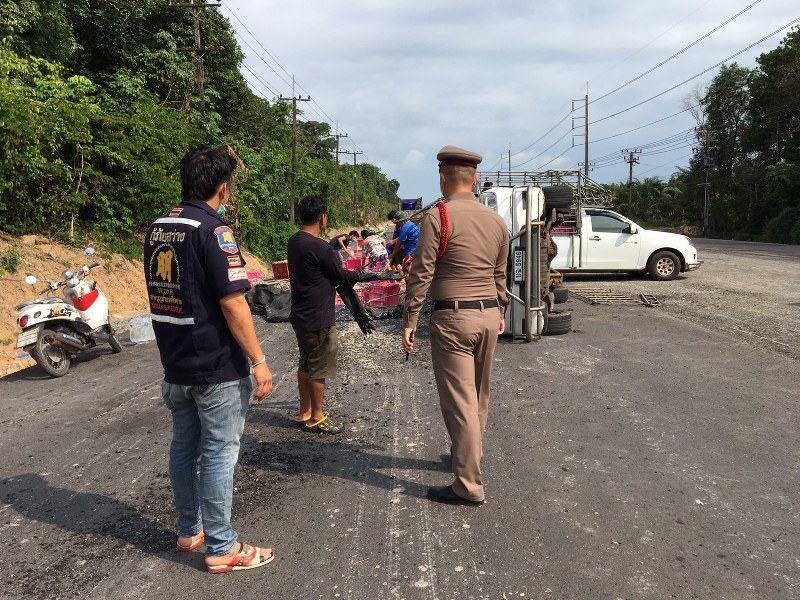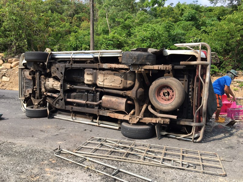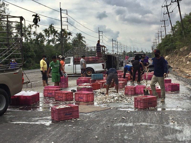 นายแอ๊ด คนขับรถคันเกิดเหตุ เล่าให้ฟังว่าก่อนเกิดเหตุขับรถกระบะคันดังกล่าว กลับจากบรรทุกปลากะตักมาจากอำเภอเกาะช้าง มุ่งหน้าไปส่งปลาที่บ้านคลองจากต.คลองใหญ่ อ.คลองใหญ่ โดยบรรทุกปลามาทั้งหมดจำนวน 3 ตัน และขับด้วยความระมัดระวังเพราะยางเริ่มเก่าแล้ว เมื่อมาถึงที่เกิดเหตุ ยางหลังเกิดระเบิดเสียงดังสนั่น ตนพยายามประคองรถแต่ไมไหว รถเสียหลักหมุนพลิกตะแคงจนสิ่งของกระจายเกลื่อนถนนดังกล่าว นายแอ๊ดบอกว่าสาเหตุน่าจะเกิดจากบรรทุกหนักเกินไปและยางรถสภาพเก่าแล้ว รับน้ำหนักไม่ไหวจนระเบิดดังกล่าว เบื้องต้น อาสาสมัครกู้ภัย ช่วยอำนวยความสะดวกจัดจราจรและเก็บสิ่งของต่างๆดังกล่าวให้ด้วย