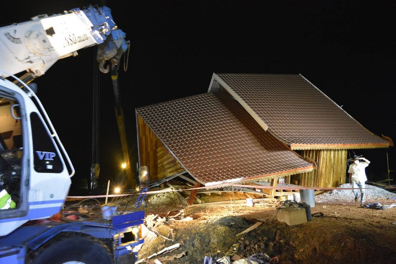 ที่เกิดเหตุอยู่หลังคณะเทคโนโลยีอุตสาหกรรม มหาวิทยาลัยนครพนม ห่างถนนคอนกรีต 50 เมตร พบบ้านไม้ทรงไทย ไม่มีเลขที่ ซึ่งอยู่ระหว่างถมที่และสร้างใหม่ พังครืนถล่มลงมาและทรุดตัวเอียง พบเสาปูนคอนกรีต 2 ต้นหักเอียงงอ เศษซากไม้หักกระจุยกระจาย โครงเหล็กนั่งร้านข้างบ้านล้มระเนระนาด ใต้ซากบ้านหลังดังกล่าวพบศพนายมาร์ค (ชื่อเล่น) วัย 15 ปี นักเรียนชั้น ม.3 โรงเรียนบ้านนางัว ต.นางัว อ.นาหว้า จ.นครพนม สภาพนอนตะแคงข้าง สวมเสื้อยืดแขนสั้นกีฬาน้ำเงิน กางเกงขายาวสีดำ ถูกคานบ้านและเสาทับเสียชีวิตคาที่