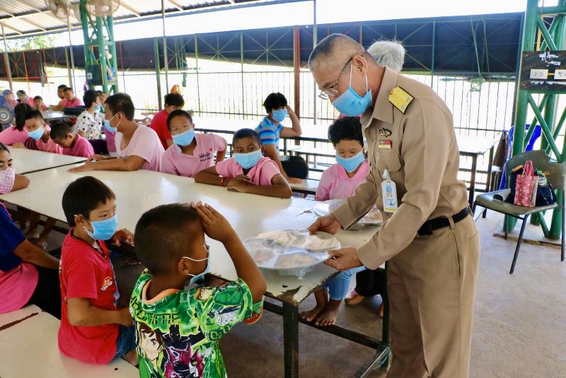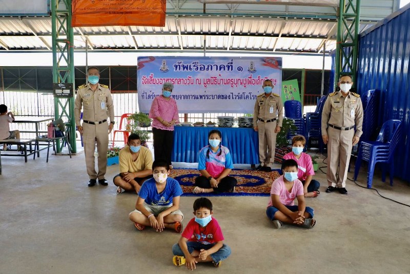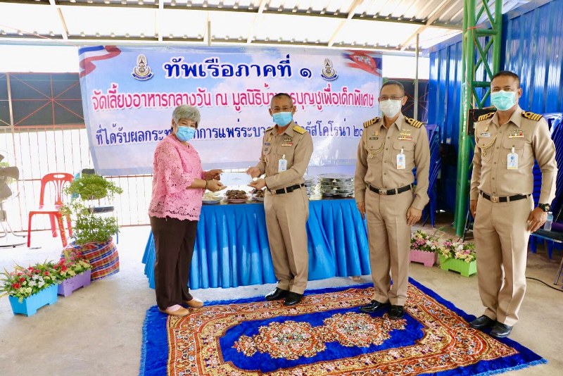 วิกฤตโควิด-19 ทัพเรือภาคที่ 1 พร้อมชมรมภริยาฯ เลี้ยงอาหารกลางวันมอบแมสก์ เพื่อเด็กพิเศษบ้านครูบุญชู 4 วัน
