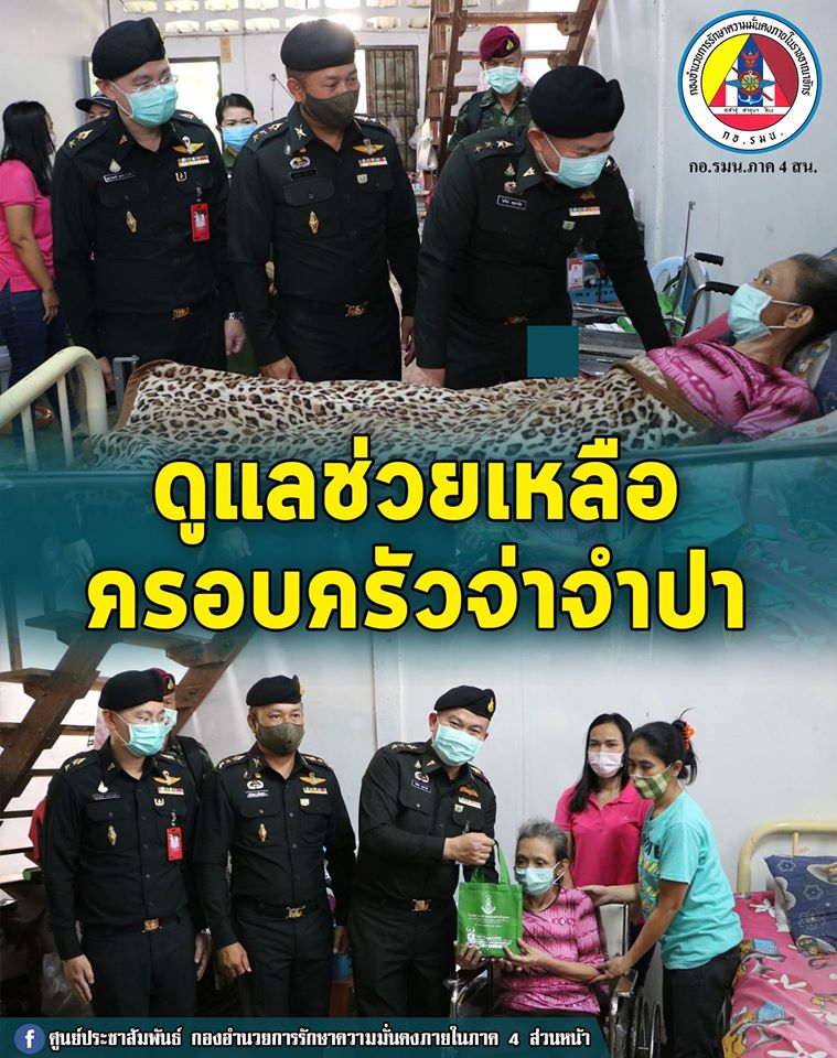 เมื่อ 21 เม.ย. 63 ณ อ.ห้วยยอด จ.ตรัง กองทัพภาคที่ 4 มอบหมายให้ โรงพยาบาลค่ายเทพสตรีศรีสุนทรและ พัน.สร.5 ดำเนินการจัดหาเตียงผู้ป่วยและรถเข็นผู้ป่วย พร้อมทั้งจัดชุด แพทย์, พยาบาล และ นักกายภาพบำบัด เพื่อให้การแนะนำในการดูแล และรักษาพยาบาล มารดาของ จ.ส.อ.พีรศักดิ์ จำปา ซึ่งเป็นผู้ป่วยติดเตียง ตามนโยบายการดูแลกำลังพล และครอบครัวของกองทัพบก
