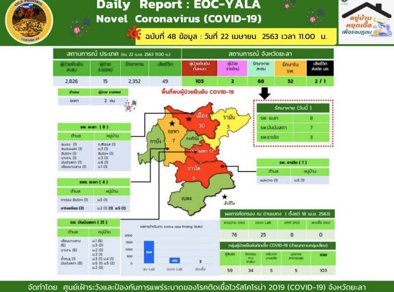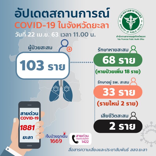 ศูนย์ปฎิบัติการภาวะฉุกเฉินกรณีการแพร่ระบาดของโรคติดเชื้อไวรัสโคโรน่า 2019 (COVID-19) จังหวัดยะลา โดยสำนักงานสาธารณสุขจังหวัดยะลา เผย สถานการณ์ COVID-19 ในจังหวัดยะลา วันที่ 22 เมษายน 2563 พบมีผู้ป่วยรายใหม่เพิ่มขึ้น 2 ราย ในอำเภอยะหา ผู้ป่วยยืนยันที่ 103 ราย รักษาหายเพิ่มขึ้นถึง 18 ราย หายสะสมแล้ว 68 ราย รักษาอยู่โรงพยาบาล สะสม 33 ราย (รายใหม่ 2 ราย) เสียชีวิต 2 ราย