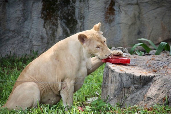 ส่วนที่ส่วนแสดงเสือ สิงโตขาว เจ้าหน้าที่นำขาหมูและเลือดสดแช่แข็ง ให้กับสิงโตขาว โดยแขวนและวางไว้ให้สิงโตขาวได้สามารถเลีย และแทะคลายร้อนกัน