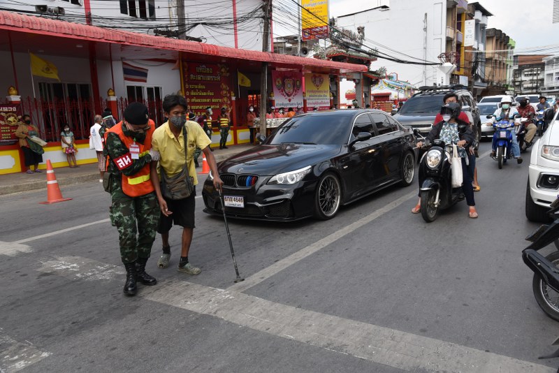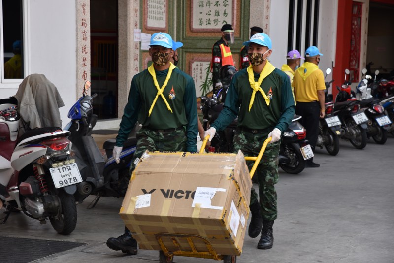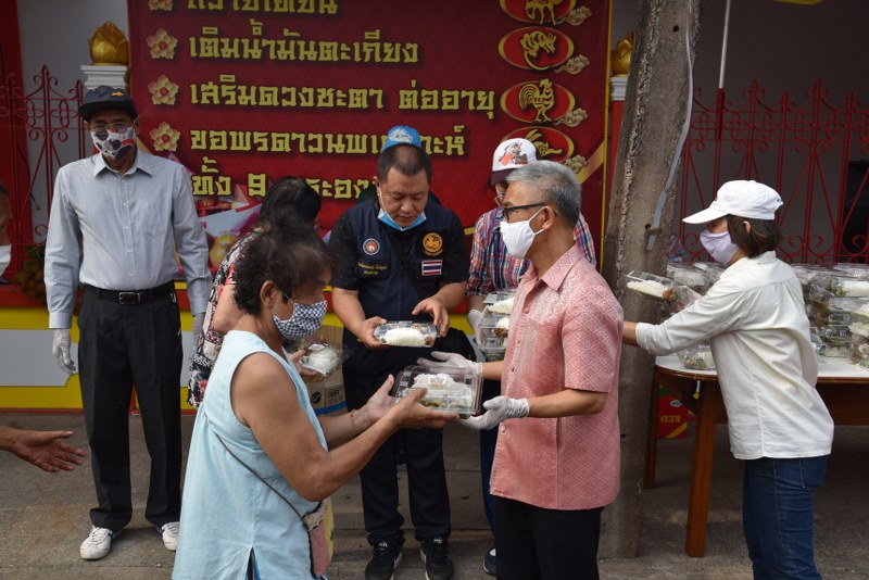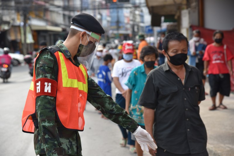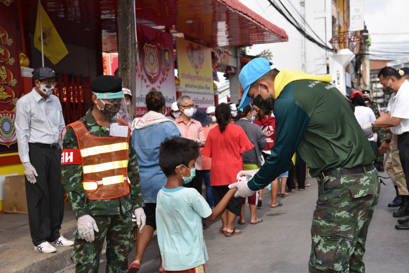 ทหาร ตำรวจ อส.สมาชิกกู้ภัย ร่วมกันจัดระเบียบ ประชาชนที่รับข้าวกล่อง ที่สมาคมสว่างกตัญญูธรรมสถาน จังหวัดจันทบุรี แบ่งเบาภาระค่าใช้จากผลกระทบโควิด -19