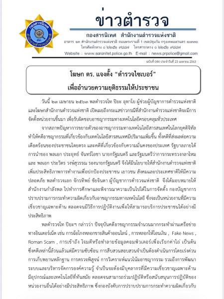 วันที่ 23 เมษายน 2563 : พลตำรวจโท ปิยะ อุทาโย ผู้ช่วยผู้บัญชาการตำรวจแห่งชาติ และโฆษกสำนักงานตำรวจแห่งชาติ เปิดเผยถึงกระแสข่าวกรณีที่สำนักงานตำรวจแห่งชาติจะมีการจัดตั้งหน่วยงานขึ้นมา เพื่อรับผิดชอบอาชญากรรมทางเทคโนโลยีครอบคลุมทั่วประเทศ จากสภาพปัญหาการขยายตัวของอาชญากรรมทางเทคโนโลยีสารสนเทศในโลกยุคดิจิทัล ทำให้คดีอาชญากรรมที่เกี่ยวข้องกับเทคโนโลยีสารสนเทศมีปริมาณเพิ่มขึ้น ทั้งคดีที่ส่งผลต่อความเดือดร้อนของประชาชนโดยตรง และคดีที่เกี่ยวข้องกับความมั่นคงของประเทศ รัฐบาลภายใต้ การนำของ พลเอก ประยุทธ์ จันทร์โอชา นายกรัฐมนตรี และรัฐมนตรีว่าการกระทรวงกลาโหม และ พลเอก ประวิตร วงษ์สุวรรณ รองนายกรัฐมนตรี จึงได้มีนโยบายให้สำนักงานตำรวจแห่งชาติเพิ่มประสิทธิภาพการทำงานเพื่อปกป้องประชาชน เยาวชน สังคมและประเทศชาติให้มีความปลอดภัย พลตำรวจเอก จักรทิพย์ ชัยจินดา ผู้บัญชาการตำรวจแห่งชาติ จึงได้มอบหมายให้ สำนักงานกำลังพล ไปทำการศึกษาและพิจารณาความเป็นไปได้ในการจัดตั้ง กองบัญชาการปราบปรามการกระทำความผิดเกี่ยวกับอาชญากรรมทางเทคโนโลยี ซึ่งจะเป็นหน่วยงานที่มีความเชี่ยวชาญเฉพาะด้าน ตลอดจนมีวิธีการปฏิบัติงานเพื่อให้สามารถบริการประชาชนได้อย่างมีประสิทธิภาพ