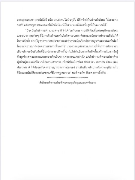 “ปัจจุบันสำนักงานตำรวจแห่งชาติ จึงได้ร่วมกับกระทรวงดิจิทัลเพื่อเศรษฐกิจและสังคม และหน่วยงานต่างๆ ที่มีภารกิจด้านเทคโนโลยีสารสนเทศ ศึกษาและวิเคราะห์ความเป็นไปได้ ในการจัดตั้ง กองบัญชาการปราบปรามการกระทำความผิดเกี่ยวกับอาชญากรรมทางเทคโนโลยี โดยจะพิจารณาถึงขีดความสามารถในการอำนวยความยุติธรรมและการให้บริการประชาชนเป็นหลัก ขอยืนยันกับพี่น้องประชาชนอีกครั้งว่า ไม่ได้ดำเนินการเพื่อปิดกั้นเสรีภาพในการรับรู้ข้อมูลข่าวสารและการแสดงความคิดเห็นของประชาชนแต่อย่างใด แต่สำนักงานตำรวจแห่งชาติจะมุ่งมั่นทุ่มเทและพัฒนาขีดความสามารถ เพื่อพิทักษ์ปกป้อง ประชาชน เยาวชน สังคม และประเทศชาติ ให้ปลอดภัยจากอาชญากรรมทางไซเบอร์ รวมถึงเป็นหลักประกันความยุติธรรมในชีวิตและทรัพย์สินของประชาชนที่มีมาตรฐานสากล” พลตำรวจโท ปิยะฯ กล่าวทิ้งท้าย
