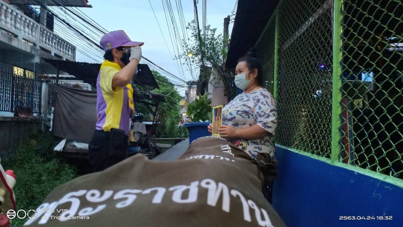 โดยเมื่อวันที่ 24 เมษายน 2563 ได้เชิญถุงพระราชทาน จำนวน 5,446 ถุง ไปมอบแก่ประชา ชน ในพื้นที่กรุงเทพมหานคร รวม 26 ชุมชน ใน 6 เขต ได้แก่ เขตธนบุรี, เขตบางซื่อ, เขตบางกอกน้อย, เขตมีนบุรี, เขตสายไหม และเขตหนองจอก อาทิ ชุมชนโกวบ๊อพัฒนา, ชุมชนโรงเจ 1, ชุมชนสุทธาราม, ชุมชนวัดประดู่, ชุมชนตรอกไผ่, ชุมชนหลังวัดดุสิตาราม, ชุมชนพรานนก ซอย 9, ชุมชนริมคลองลาดบัวขาวตะวันออก, ชุมชนคลองลำไผ่, ชุมชนริมคลองสอง, ชุมชนริมรั้วทอ., ชุมชนพูนทรัพย์, ชุมชนส่งเสริมศีลธรรม,ชุมชนมิตรไมตรีสัมพันธ์ และชุมชนแผ่นดินทองคู้บนพัฒนา