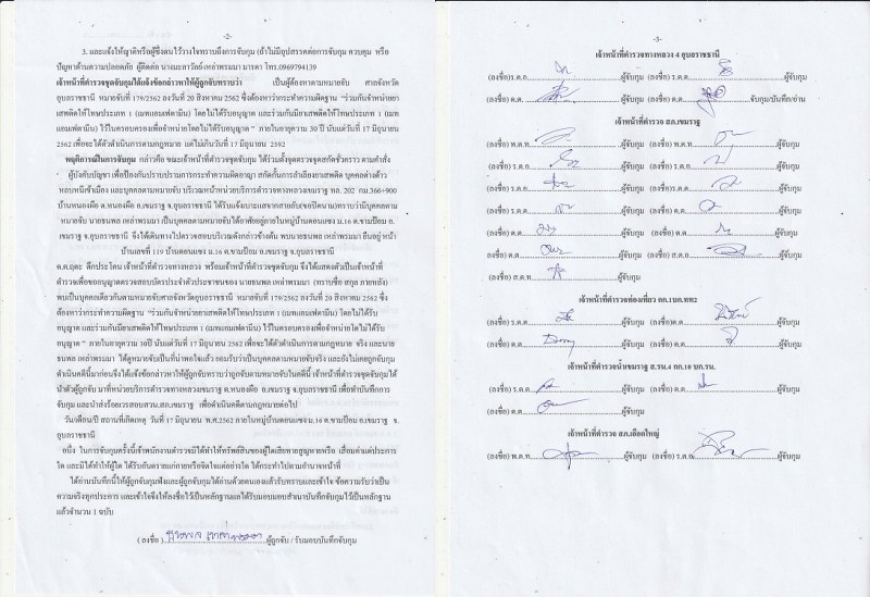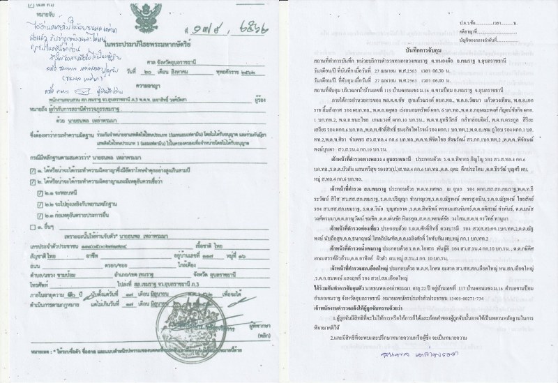 ผู้ถูกจับรับทราบข้อกล่าวหาและสิทธิต่างๆแล้ว จึงได้แจ้งให้ผู้ถูกจับทราบ และใด้สอบถาม นาย ธนพล เหล่าพรมมา ผู้ถูกจับรับว่าเป็นบุคคลตามหมายจับนี้จริง และไม่เคยถูกจับในคดีนี้มาก่อน จึงได้ทำการบันทึกการจับกุม และนำตัวผู้ต้องหา ส่ง ร้อยเวรสอบสวน สภ.เขมราฐ จว.อุบลราชธานี เพื่อดำเนินการตามกฏหมายต่อไป